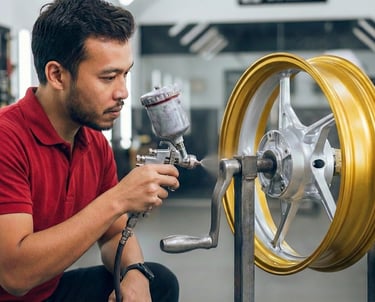 Spesialis cat velg, body, dan rangka motor dengan hasil rapi dan warna tajam.
